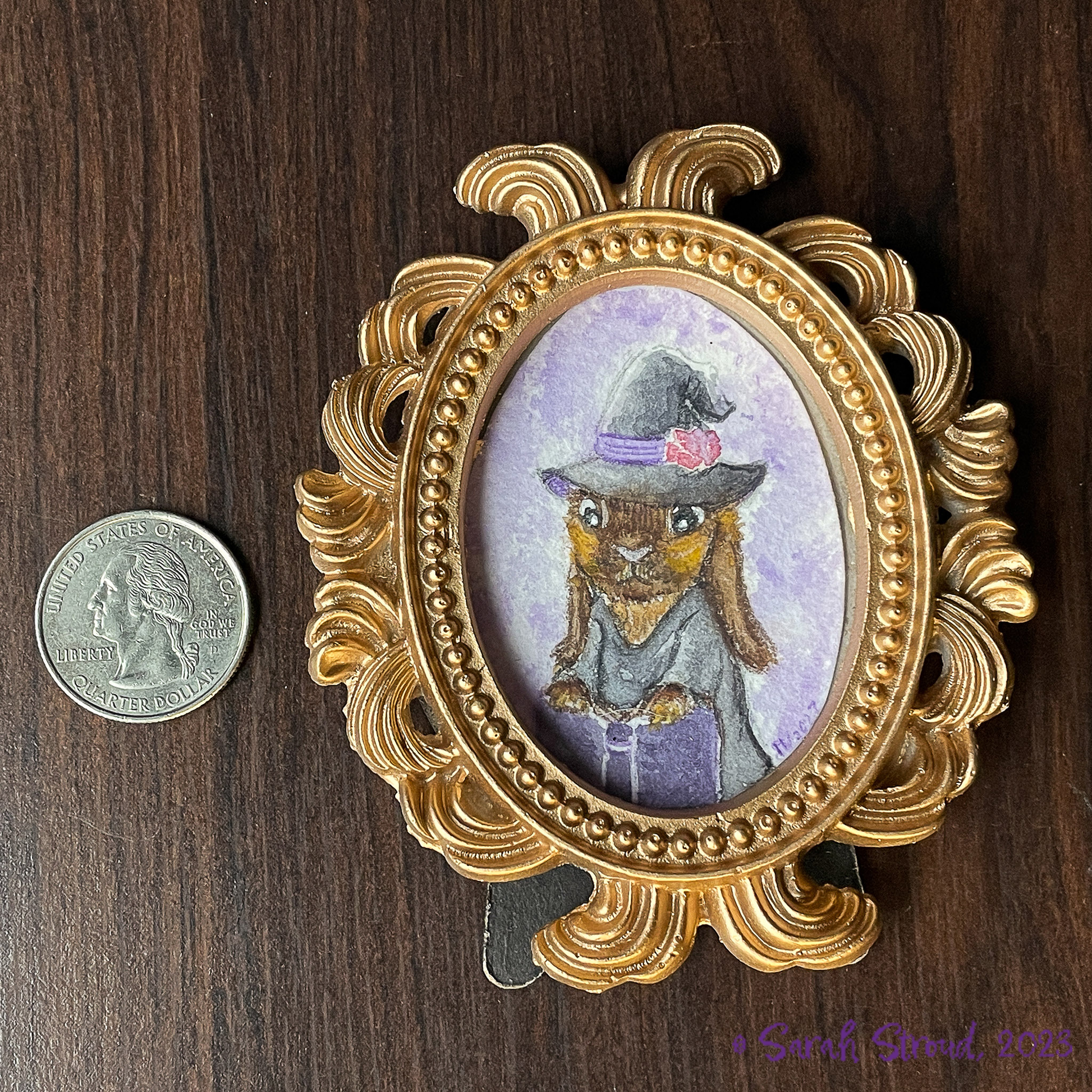 Fit for a bunny's hearth and home is this tiny 2" x 2.5" gold framed painting. No matter the size of your space, this piece will fit anywhere. Just watch out for wee furry friends looking to decorate, lest they steal it for their mantles. Take this tiny treasure home with you today!